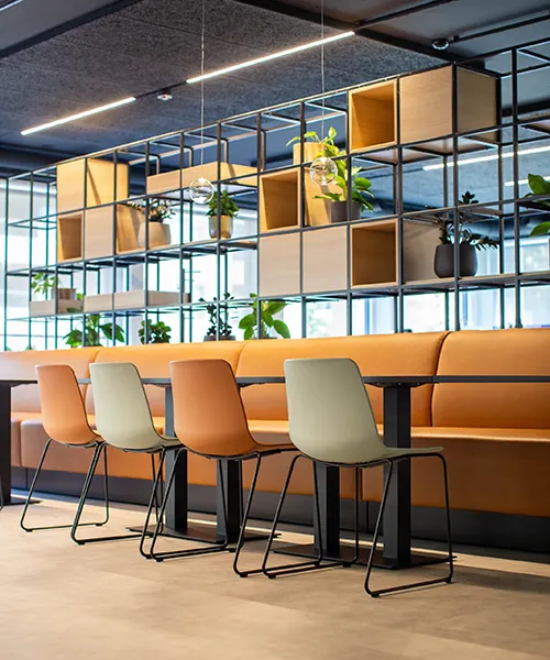 At Theo Boons, a heating and sanitary installation company in Arendonk, we furnished several workspaces, the meeting room, the executive office and the cafeteria. The matte black table in the meeting room is the Diablo table, made from Fenix, a soft material that resists fingerprints. Combined with the upholstered Verle meeting chair, this table gives the room a truly sophisticated look.