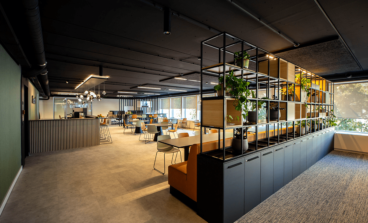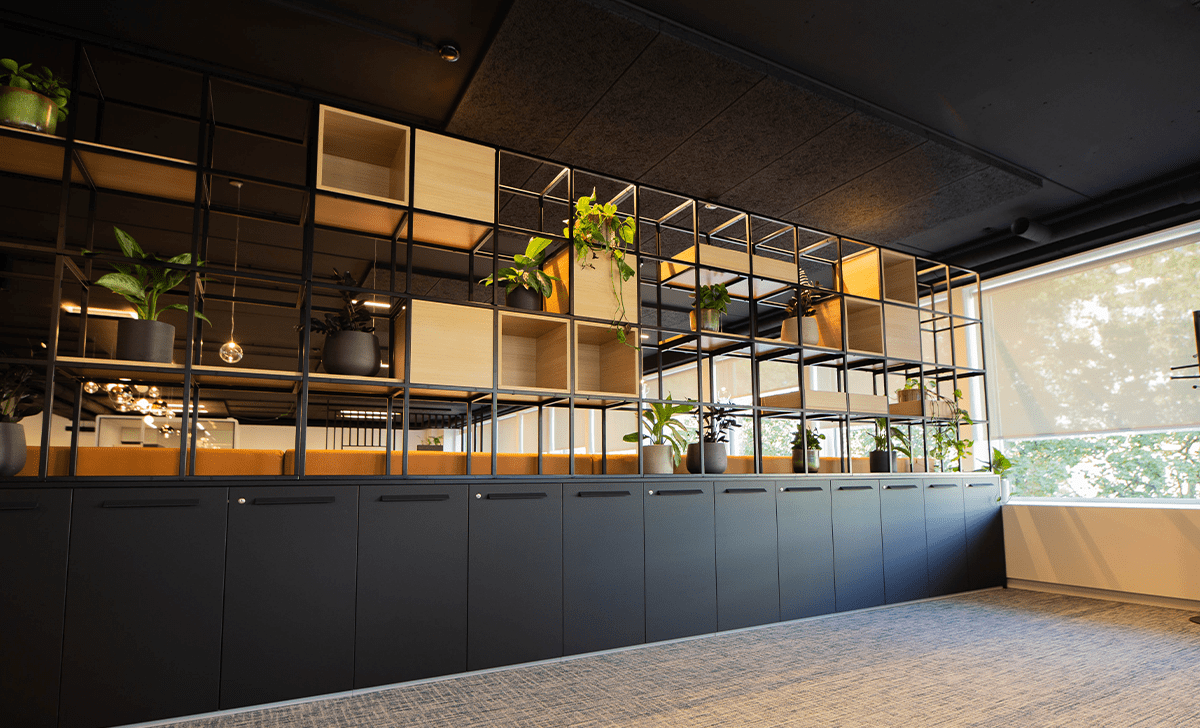For the partition wall, we used our matte black Uni cabinets along with a custom-made open shelving unit. This creates a spatial separation between the workstations and the cafeteria.